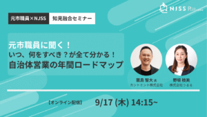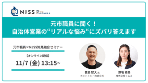 2025年8月07日(木) 元市職員に聞く!選ばれる企業になる自治体営業とは? 元市職員×NJSSの知見融合セミナー。 入札案件の作られ方、自治体が取引したい企業像、現場職員の実務課題を解説。 再現性ある自治体営業の進め方を学ぶオンラインセミナー。