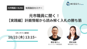 2025年10月23日(木) 元市職員に聞く!【実践編】計画情報から読み解く入札の勝ち筋 元札幌市職員が解説する実践セミナー。 自治体の計画情報や過去の入札データを読み解き、競合が見落とすターゲット自治体の見極め方と落札確度を高める入札戦略を紹介します。